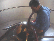 何をしているのかといえば、このタンクの上にしがみついてタンクの下から抜き取った果汁をホース先端のノズルから浮いている果帽に噴出させているのです。これはタンク内の果汁(ワイン)を均一にして、果帽からの色素抽出を促す、という意味を持っています。また酸素を取り込んで酵母のアルコール醗酵の活性を高めます。 |