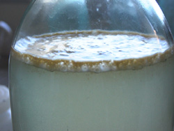 | 酵母添加直後はまだ果汁は透明です。その時の瓶の底にはブルブ(前回参照)が堆積しています。 | |