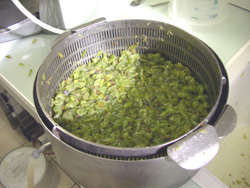 実験条件毎に得られた果汁です。 きれいな緑色をしています。 |