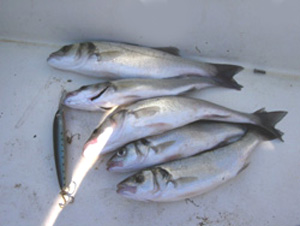 泳がせ方にテクニックがあるらしく、私の方はアタリがないままに時間が過ぎていきます。とその時、パパにアタリがありうまくかかったようです。小さい、小さいと言いながら寄せてきたのはやはりバール、というよりフランス語でルヴィンヌという子供クラスでした。 |