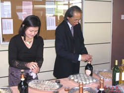 宴たけなわの時にデュブルデュー教授からプレゼントを頂きました。思いもかけぬ事でびっくりです。しかし箱の中身を見て二度びっくり。 さてこのソーテルヌのマグナムは?ドワジデーヌの1948なり!! そして、ラボのスタッフとの記念撮影です。 |