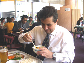 お箸をつかって上手に冷ややっこを食べているところ。「味がない」というので「だからお醤油をかけて、生姜と葱と一緒に食べる」と教えたところです。 その前日は彼にカタヤキソバを食べさせてみたのですが、これも美味しいといっておりました。和食は好きみたいです! |