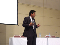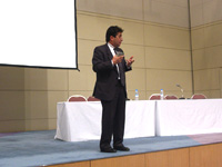 今回のメインの講演の後の質議応答でのスナップ。 質問にノッてきて答えているところです。 |