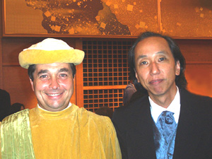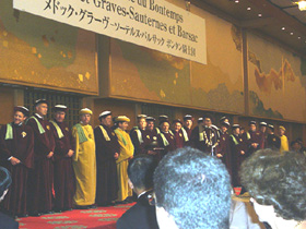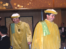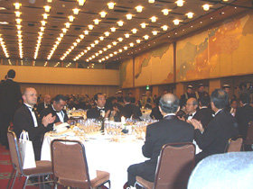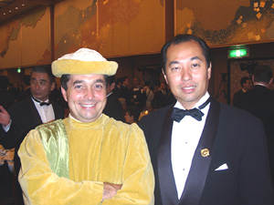 この講演の後、タキシードに着替えてホテル・オークラへと向います。 メドック・グラーブーソーテルヌ・バルサックのワイン騎士団の騎士授与式及びそのパーティに出席するためです。 私にとりましてこのような席に招待されることは初めてのことでしたので、どのようなセレモニーなのか、食事ではどんなワインがサーヴィスされるのかを楽しみにしておりました。ディナーに先立ち別室で約10人程の方が受賞され、祝福を受けます。私が存じ上げる方は一人もおらず、やはり業界関係なのかナ、と思っておりました。 それにしてもやけにプレスが多い。式を司るジャン・ミッシェル・カーズから「ディナー時にあと2人の受賞がある」との発表がありました。これはきっと大物に違いありません。 さて、その会場は大変ひろく、10人ずつのテーブルが31、そしてそれ以外に40人程が座れるヴィップ席が正面に用意されています。 ここへ騎士団が入場します。 |
